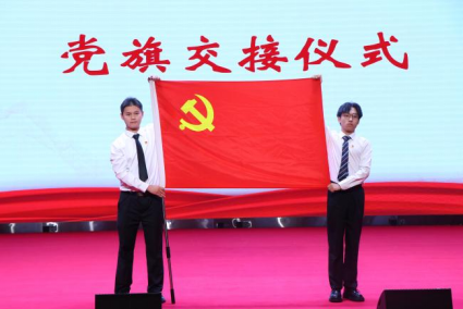 太阳成集团tyc151cc员工第二党支部副书记黎鑫然同志及新任支委代表苏嘉豪同志上台进行党旗交接仪式。