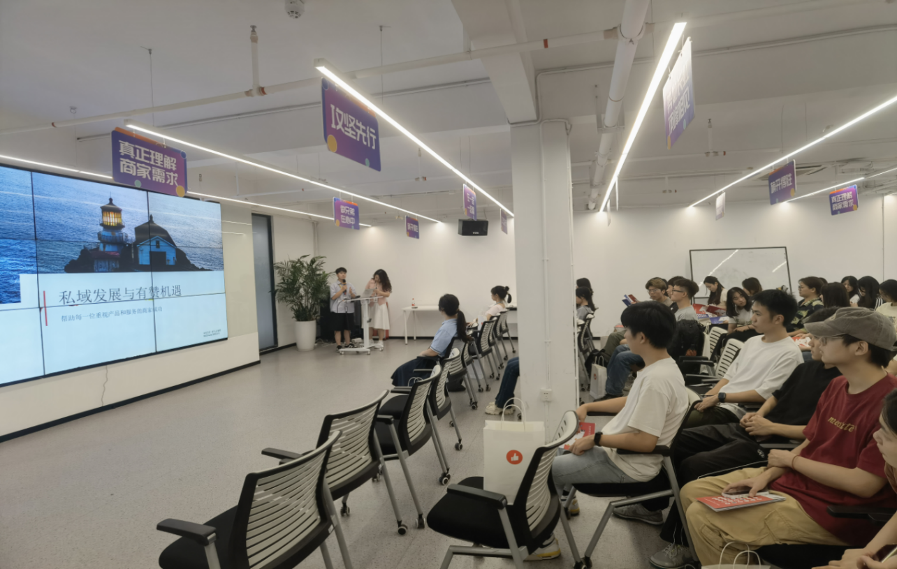 有赞公司为同学们精心安排了本次行程,分别由公司业务部负责人陈元宝、人力部门负责人“兔子”对有赞平台的产品应用、私域电商市场发展以及企业人才发展、招聘需求等内容进行了详细介绍,并重点就私域平台发展和企业人才招聘等问题与同学们进行了良好的互动。
