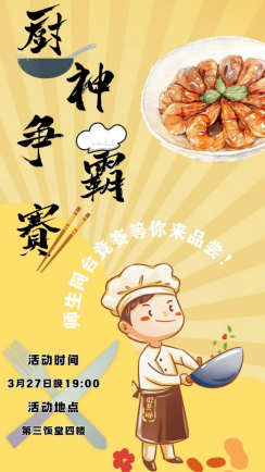 (李慧婷,何玟静)为了丰富校园文化生活,增强员工与老师之间的互动,提升员工的团队协作能力和动手能力,“烹”然心动,“味”爱而来厨神争霸赛将于3月27日在三饭四楼上演。