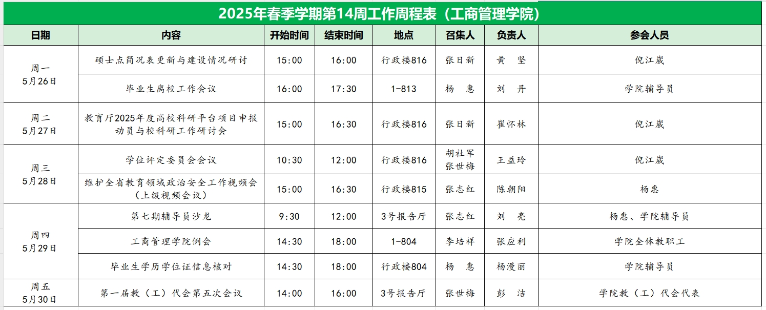 2025年春季学期第14周工作周程表