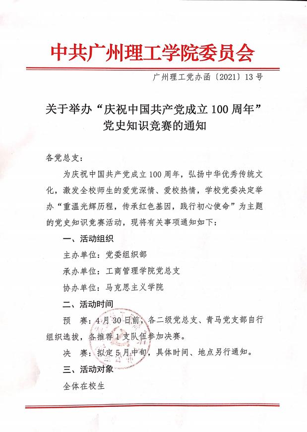 关于举办“庆祝中国共产党成立100周年”党史知识竞赛的通知