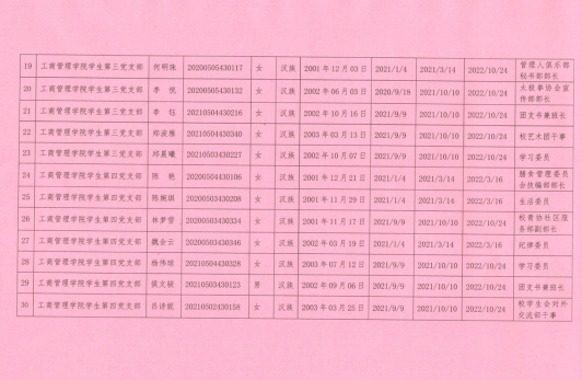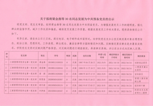 经党支部、觉总支审查,拟将梁金燕等30名同志发展为中共预备党员,为增强发展觉员工作的透明度,强化群众的监督作用,减少工作失误和偏差,确保党员发展工作质量,根据发展党员工作有关要求,现将具体情况公示如下。