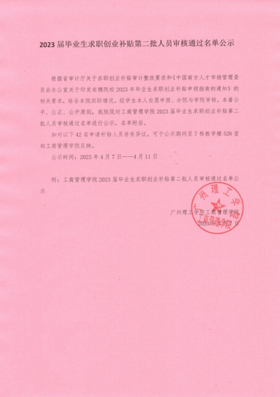 (杨伟琼)根据省审计厅关于求职创业补贴审计整改要求和《中国南方人才市场管理委员会办公室关于印发在穗院校2023年毕业生求职创业补贴申领指南的通知》的相关要求,结合本院实际情况,经员工本人自愿申报、分院与公告审核,本着公平、公正、公开原则,公司现对2023届毕业生求职创业补贴第二批人员审核通过名单进行公示,名单附后。