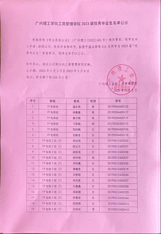 根据公司《员工奖励办法》(广州理工{2022}165号)相关要求,经员工本人申请、班级公示、院系评审等环节,拟授予温永荣等111名同学为2023届“优秀毕业生”荣誉称号,现将名单予以公示。